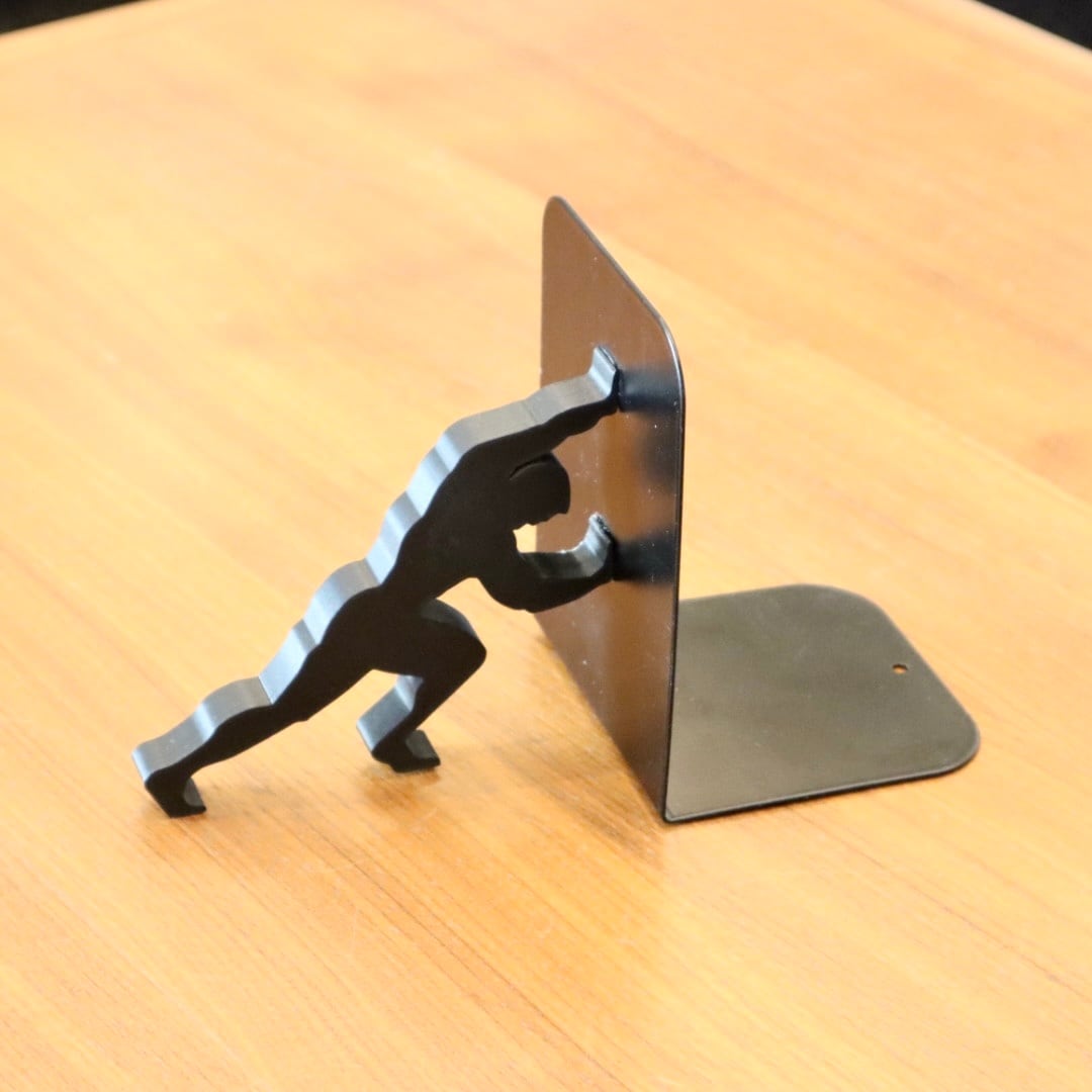 ブックエンド、本立て。 両側2個セットですので注意してください。 サイズ:本体部分は約120㎜×60㎜。 シルエット部分は約100㎜×80㎜。 材 質:バイオプラスチック